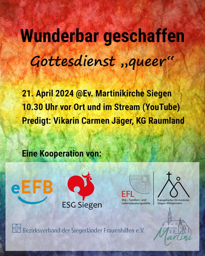 Unter der Überschrift "Wunderbar geschaffen" (Ps 139,14) laden die Martini-Kirchengemeinde Siegen, das Schulreferat, die Erwachsenenbildung sowie die Ehe-, Familien und Lebensberatungsstelle des Kirchenkreises Siegen-Wittgenstein in Zusammenarbeit mit dem Bezirksverband der Siegerländer Frauenhilfen e. V., sowie die Ev. Studierendengemeinde Siegen zu einem besonderen Gottesdienst ein. Um 10.30 Uhr feiern wir gemeinsam einen Gottesdienst "queer". Zu diesem sind alle Menschen herzlich eingeladen. Wer nicht vor Ort in der Siegener Martinikirche dabei sein kann, hat die Möglichkeit den Gottesdienst zu streamen: https://www.youtube.com/@Martinisiegen/streams. Die Predigt hält Vikarin Carmen Jäger, KG Raumland; Die Liturgie steht unter der Leitung von Studierendenpfarrer Ralph van Doorn.