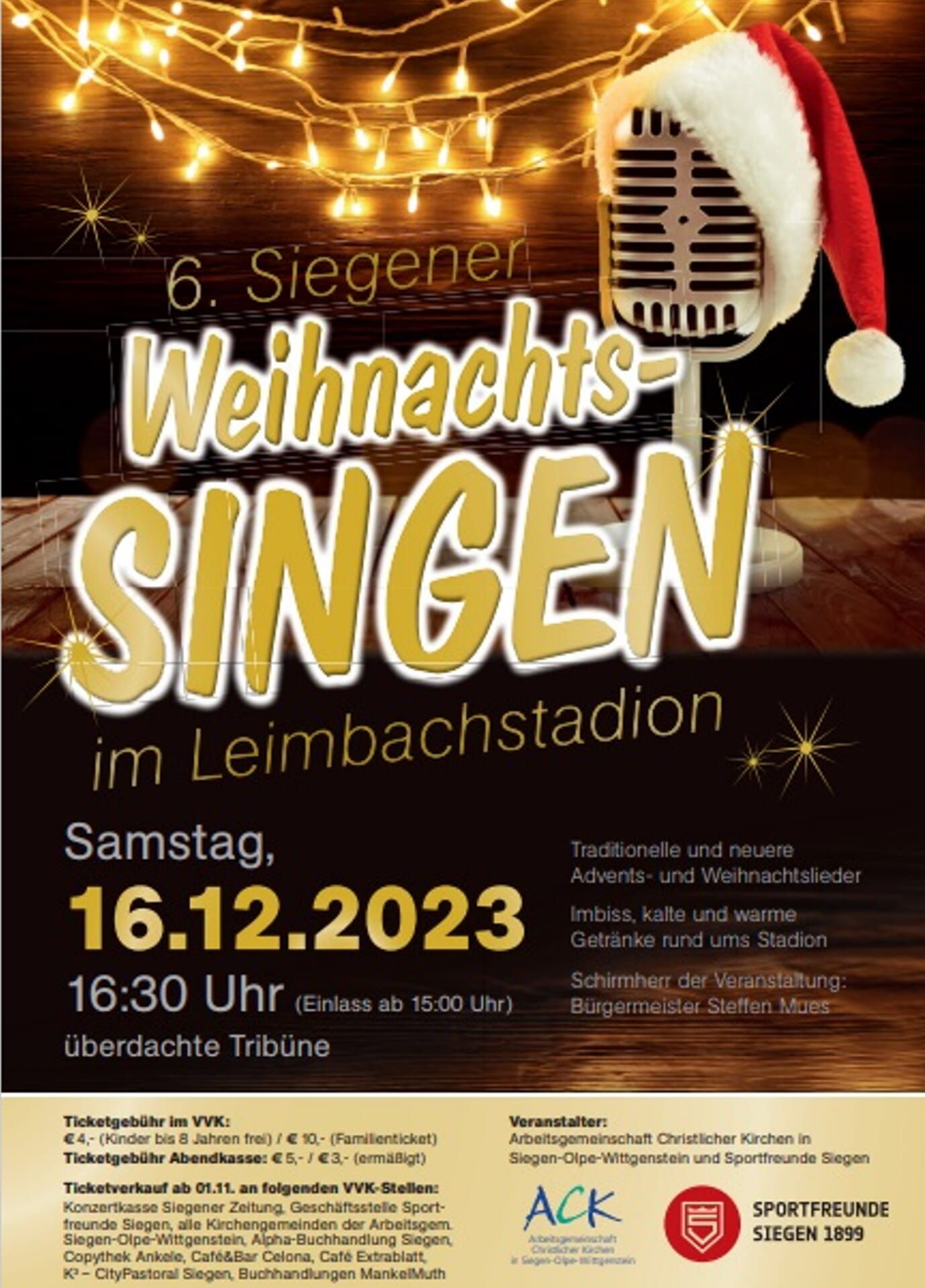 Wie inzwischen in vielen anderen Städten soll nach den Pandemiejahren auch in Siegen wieder ein Weihnachtssingen stattfinden. Am Samstag vor dem dritten Advent, dem 16. Dezember 2023 sind alle, die mitsingen und mitfeiern möchten ab 16.30 Uhr ins Leimbachstadion eingeladen. Die Tore werden circa eine Stunde vorher geöffnet haben.