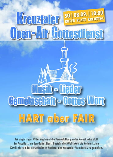 Zum Gottesdienst können gerne Sitzgelegenheiten mitgebracht werden. Im Anschluss an den Gottesdienst besteht die Möglichkeit, auch die kulinarischen Köstlichkeiten der verschiedenen Anbieter des Kreuztaler Weindorfes zu genießen. Bei schlechtem Wetter findet der Gottesdienst in der Kreuzkirche in Kreuztal statt.