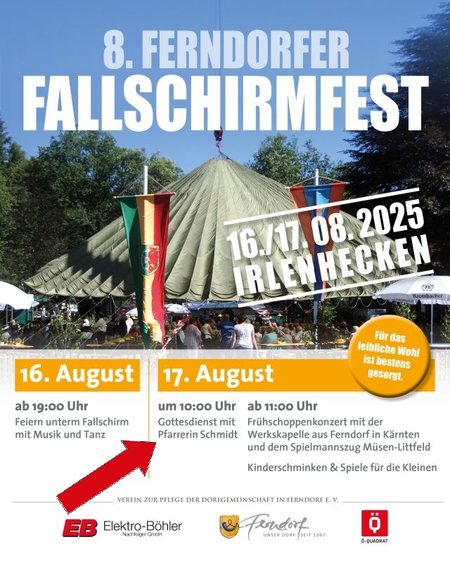Der Sonntags-Gottesdienst am 17. August findet nicht in der Ferndorfer Kirche statt, sondern im Rahmen des Fallschirmfestes in Irlenhecken.