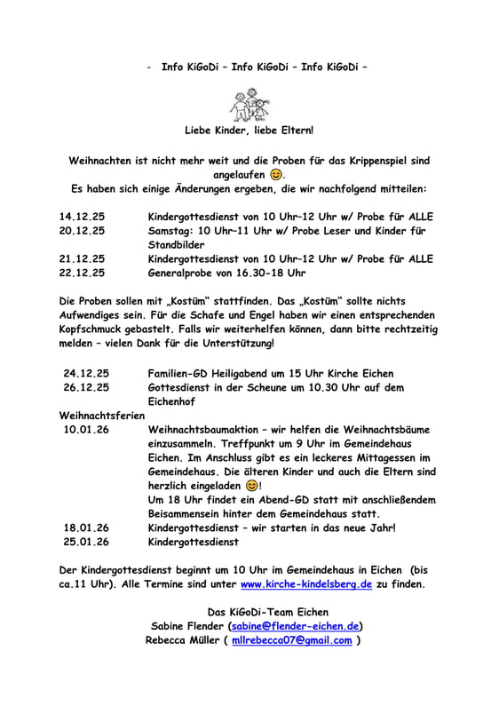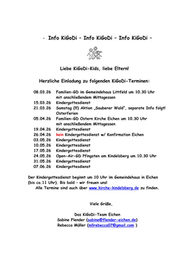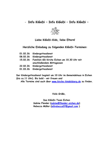 Und vielleicht gibt es auch die eine oder den anderen, der gerne im KiGoDi mitarbeiten möchtel. Lasst Euch einladen und sprecht uns an!